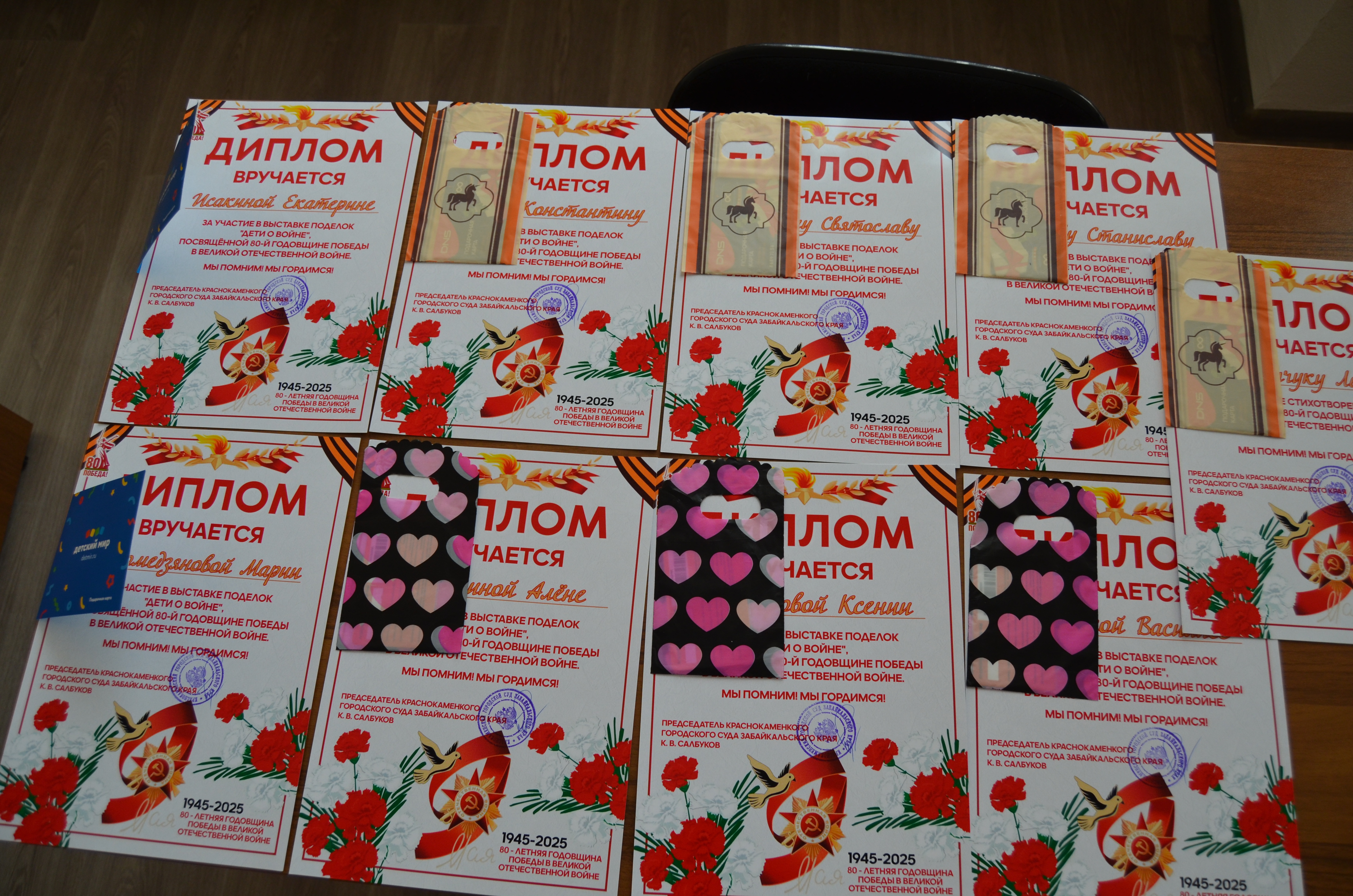В честь 80 годовщины со дня Победы в Великой Отечественной войне Краснокаменским городским судом была организована выставка поделок под названием: «Дети о войне». 23 мая 2025 года участники выставки были приглашены в Краснокаменский городской суд для награждения. Перед вручением дипломов председатель Краснокаменского городского суда К.В. Салбуков поблагодарил ребят за участие в выставке, отметил, что ребята отнеслись к выполнению поделок ответственно, приняли активное участие. Также сказал, как важно помнить о подвигах в Великой Отечественной войне, чтить память наших предков. Пресс-служба Краснокаменского городского суда |